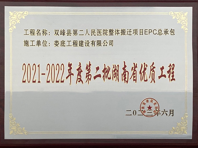 2021-2022年度雙峰縣第二人民醫院整體搬遷項目第二批湖南省優質工程獎牌