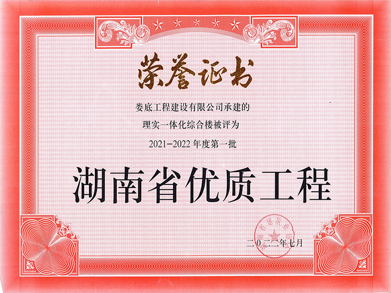 2021-2022年度第一批湖南省優質工程榮譽證書(婁底職業技術學院理實一體化綜合樓)