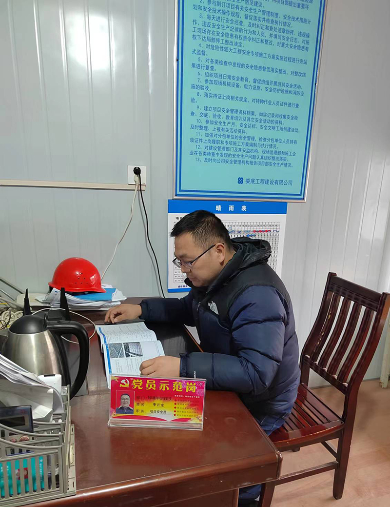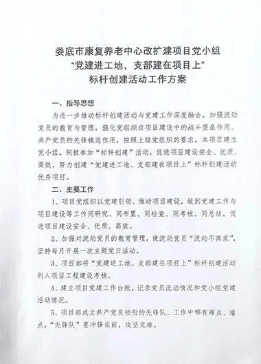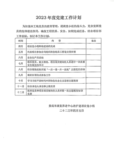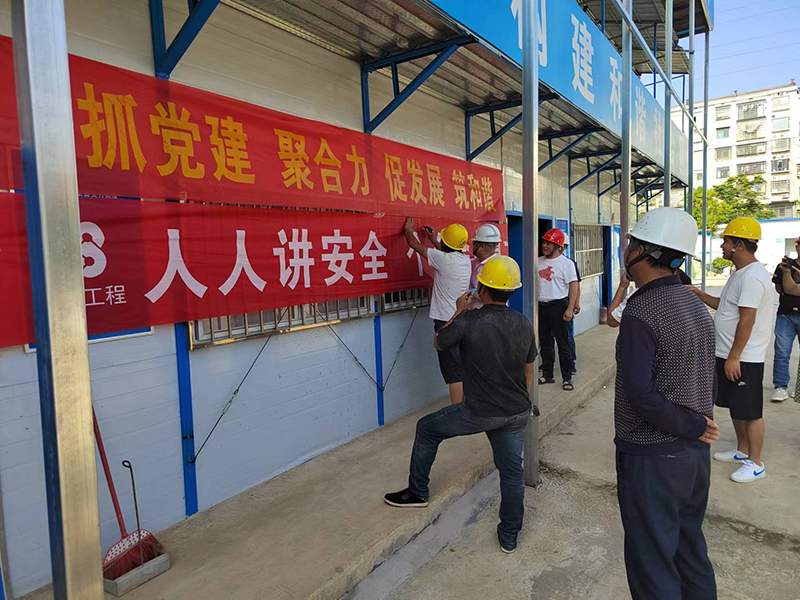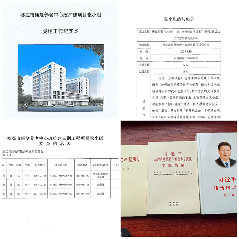 公司黨支部秉承“抓黨建就是抓生產力”的理念,全力推進“黨建進工地、支部建在項目上”標桿創建活動,努力實現“生產一線有黨員、業務骨干是黨員、關鍵時刻看黨員”的工作目標。于2023年4月1日成立婁底市康復養老中心改擴建項目黨小組,現有正式黨員3名。項目部設有專門的黨建活動場所,黨組織標識牌、黨旗、入黨誓詞等全部設置在顯目位置。場外設置了專門的黨建宣傳欄。