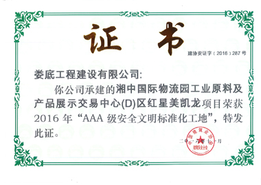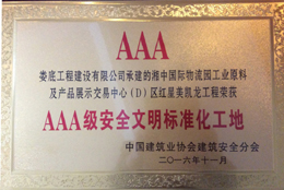 2016年11月23日,在安徽合肥舉行的中國建筑業協會安全分會2016年年會暨理事會上,我公司承建的湘中國際物流園工業原料及產品展示交易中心(D)區紅星美凱龍工程被評為AAA級安全文明標準化工地。這是我司繼2011年11月金谷建設小區8#、9#棟工程榮獲AAA級安全文明標準化工地后,又一次獲此殊榮。