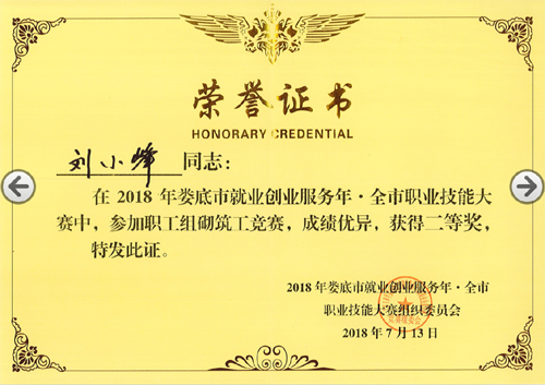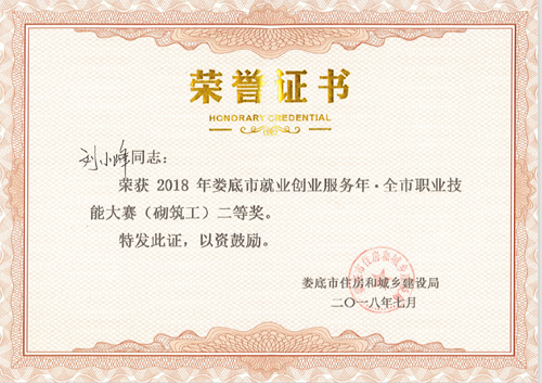 2018年7月13日,由婁底市人力資源和社會保障局、婁底市總工會、婁底市住房和城鄉建設局主辦的“2018年婁底市就業創業服務年.全市職業技能大賽”圓滿落幕。我公司選送的參賽選手劉小峰獲職工組砌筑工競賽二等獎,并被授予“婁底工匠”。