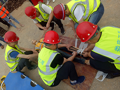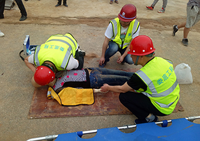 搶救組將傷員移至安全地帶,醫(yī)療救護(hù)組人員檢查傷員情況后,組織組對(duì)傷員進(jìn)行了左小腿夾板和繃帶固定綁扎,并對(duì)傷員進(jìn)行心肺復(fù)蘇和人工呼吸等急救救治。
