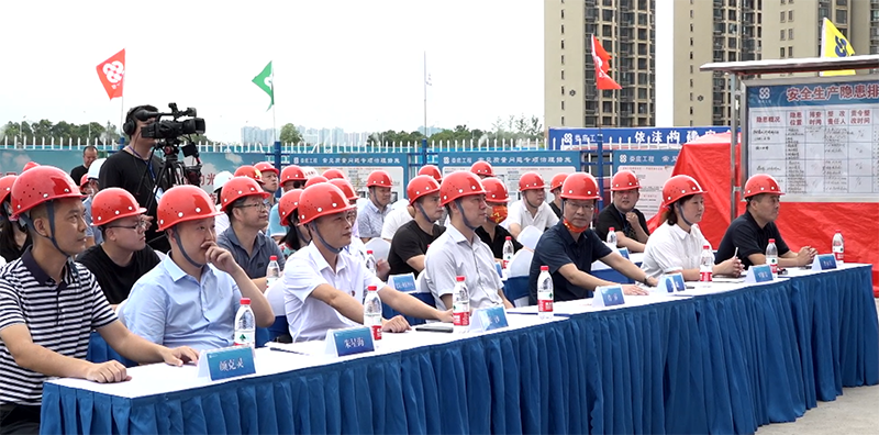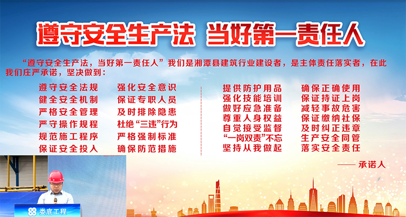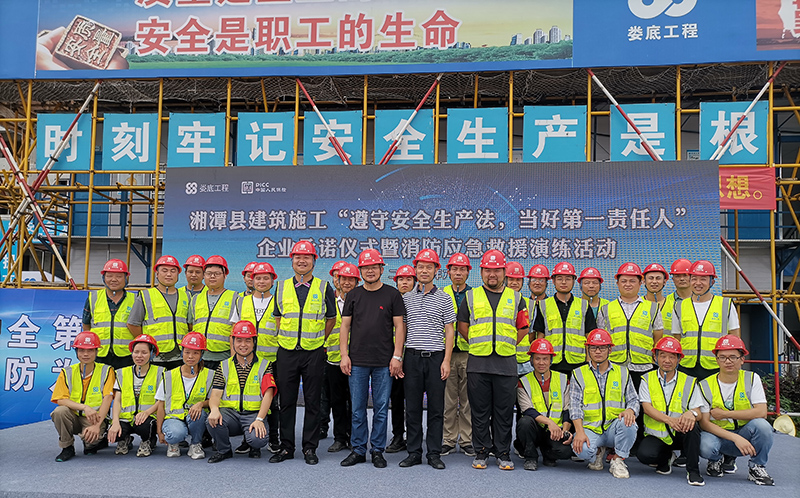 為了進一步加強安全生產工作,認真落實2022年安全生產月活動文件要求“遵守安全生產法,當好第一責任人”有效防范事故的發生,為進一步提高公司安全管理水平,規范公司安全生產過程的管理工作,為加強和促進應急管理工作,全面貫徹“安全第一,預防為主,防消結合”的消防工作方針,2022年6月23日9:00,湘潭縣住房和城鄉建設局在我司承建的湘潭江聲壹號一期項目開展了湘潭縣建筑施工“遵守安全生產法,當好第一責任人”企業承諾儀式暨消防應急救援演練活動。出市本次活動的的嘉賓有:湘潭縣人民政府副縣長肖睿,湘潭縣政府辦副主任言志強,湘潭縣住建局黨委書記局長吳能,湘潭縣應急管理局黨委書記局長:劉江華,德智置業公司總經理:龔永兵,婁底工程建設有限公司副總經理顏克靈,中國人民財產保險股份有限公司湘潭支公司經理朱星海。