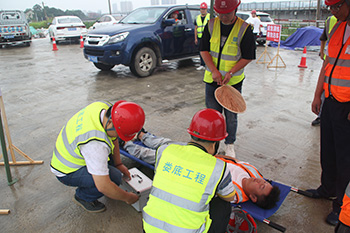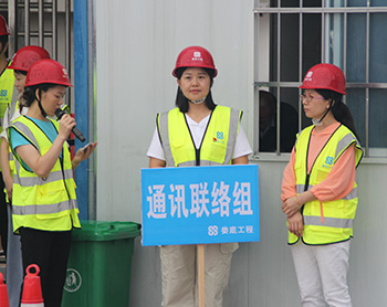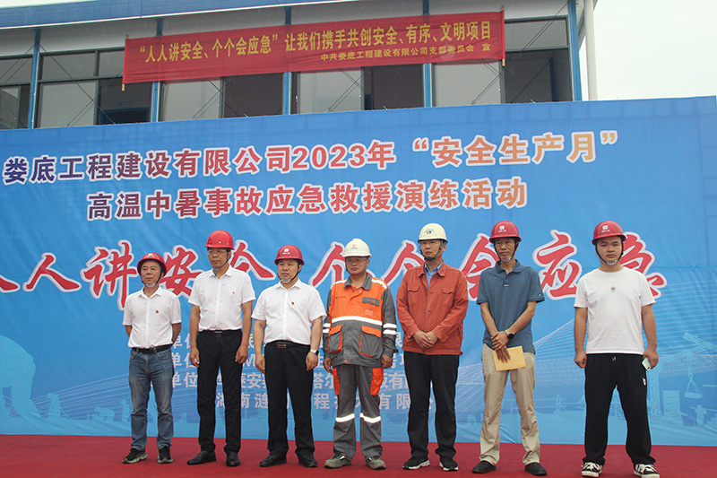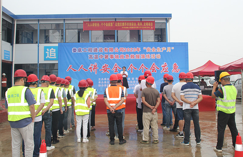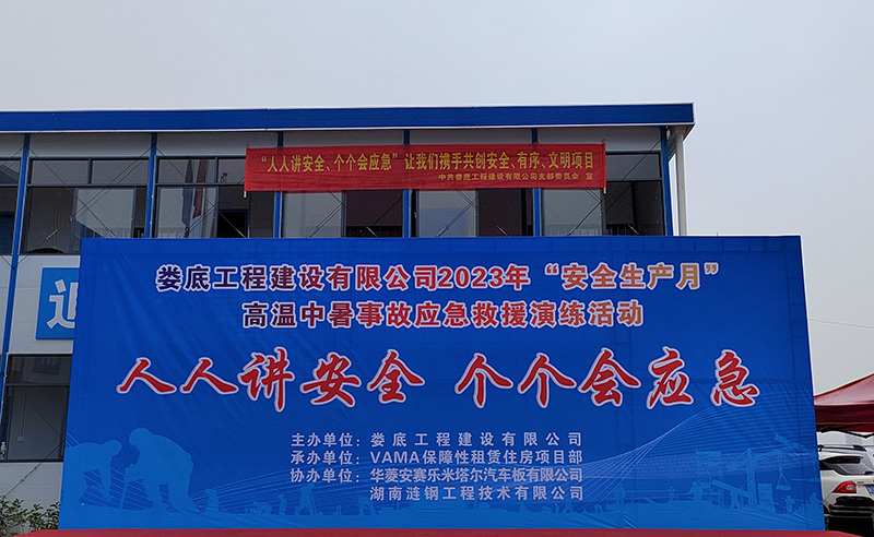 為響應省、市2023年“安全生產月”活動有關文件要求,圍繞“人人講安全 個個會應急”的主題進一步提高公司安全管理水平,規范公司安全生產過程的管理工作,本著"安全第一、預防為主、綜合治理"的安全管理方針,在發生高溫中暑事故時,能夠迅速有效進行搶救,通過高效率的組織體系應對突發事件,以最短時間、 最有效的方法控制和減少人員財產損失,減少人身傷害事故。公司于2023年6月13日上午10時在VAMA保障性租賃住房項目部開展高溫中暑事故應急救援演練活動。婁底市經開區住房和城鄉建設局領導李愛民先生、康城先生,建設單位代表藍斌先先,監理單位代表劉少勇先生,公司總經理胡勁、黨支部書記何林、副總經理彭洪偉出席了次此活動,公司各部室及婁底城區中心項目部近40余人參加了此次活動。