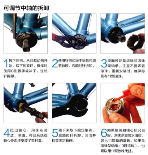 如果中軸狀況良好,潤滑后可以重新安裝使用。不過安裝后需要調(diào)節(jié)。裝入可調(diào)節(jié)軸碗,感覺到有點(diǎn)阻力即可。此時(shí)軸心應(yīng)該沒有曠量。如果必須繼續(xù)上緊可調(diào)節(jié)軸碗才能消除曠量,就應(yīng)該更換整個(gè)中軸系統(tǒng)了。如果沒有問題,安裝鎖緊環(huán),固定可調(diào)節(jié),軸碗不動(dòng),上緊鎖緊環(huán)。檢查軸心是否能順暢轉(zhuǎn)動(dòng),然后重新安裝曲柄。調(diào)節(jié)過程可能需要重復(fù)幾次。